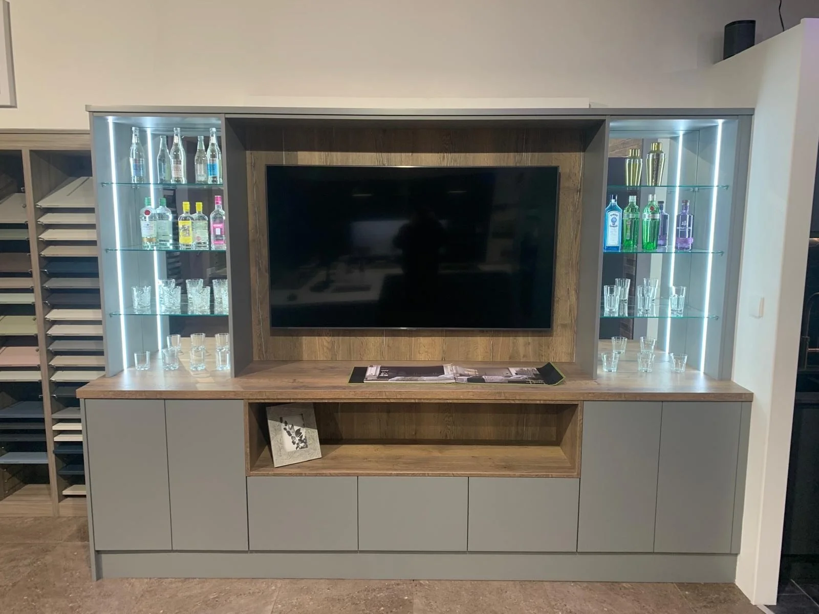 Mid Grey push open doors with Walnut top and back panel. Glass shelves including LED lights